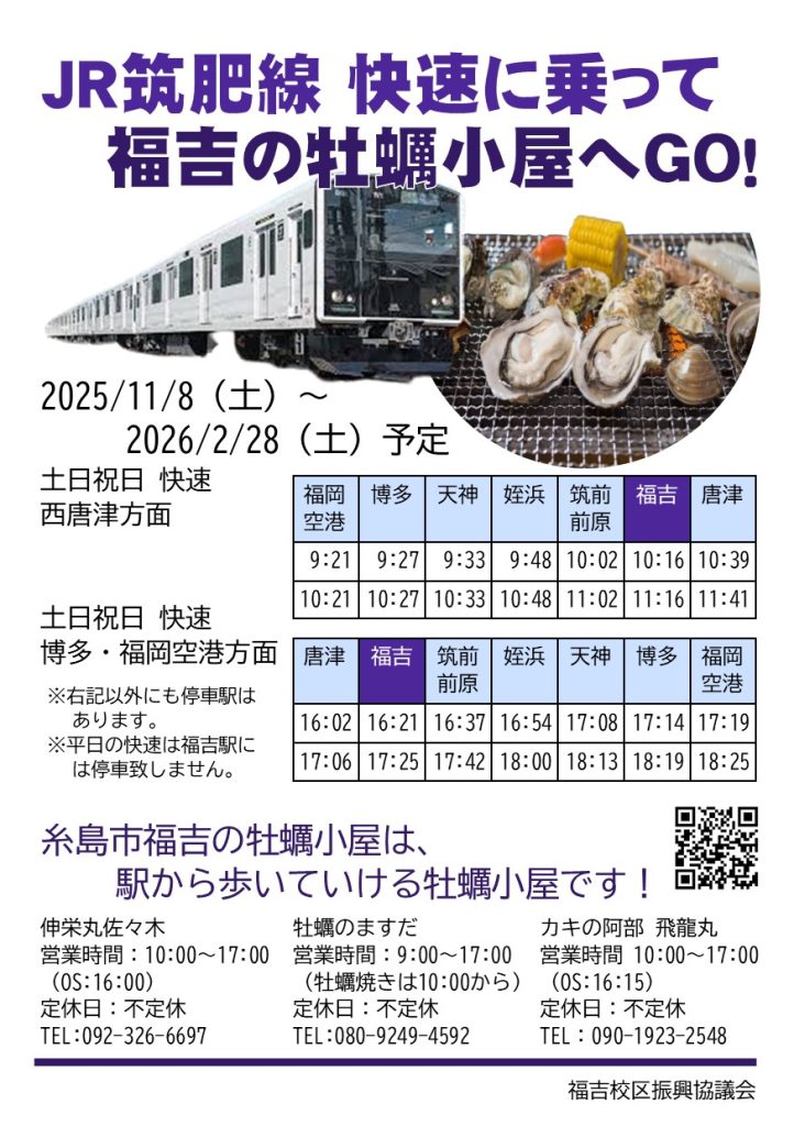 所在地 カキの阿部 飛龍丸 〒819-1631 福岡県糸島市二丈福井5490-13 福岡市からお車でお越しの場合 福岡前原有料道路 → かもめロード(二丈浜玉道路) → 吉井インター で降りて右折、踏切を渡って国道202号線を右折(福吉駅があるほう)、ファミリーマートの交差点を左折してください。 JR筑肥線でお越しの場合 福吉駅から、徒歩約10分です。